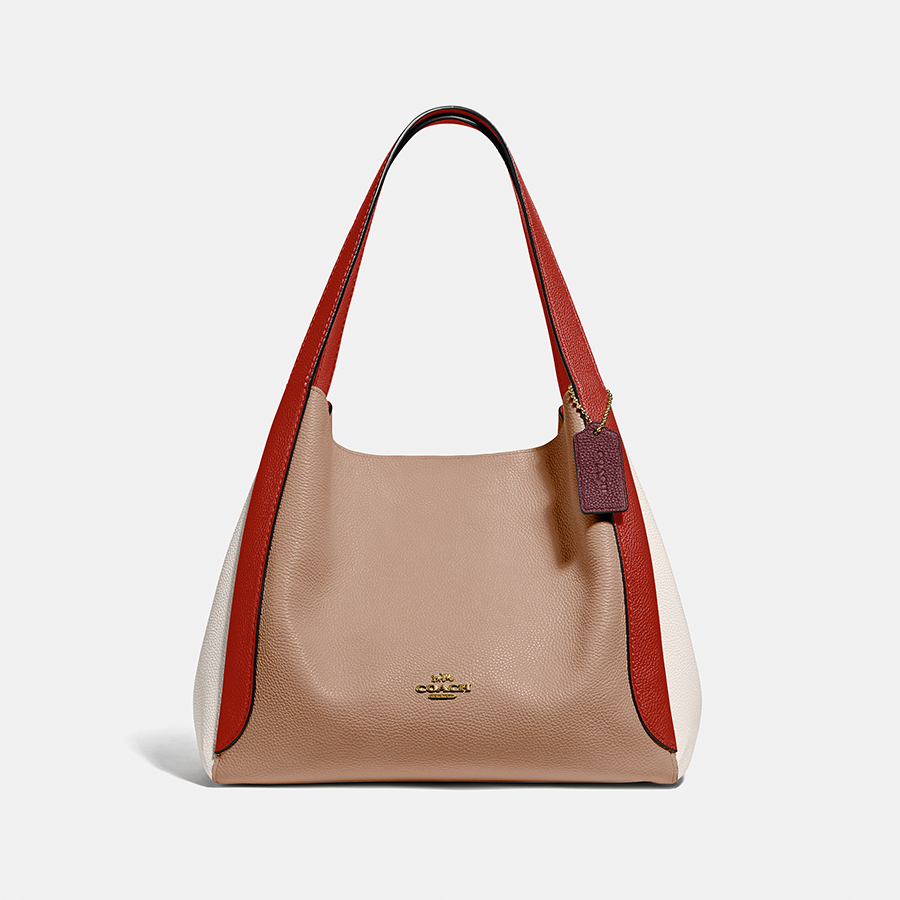 適度なハリとしなやかさを備えたポリッシュドぺブルレザーのホーボーバッグ。ベージュ系に赤をきかせたカラーブロックが、品よく合わせやすい。とても軽量で肩かけしやすく、中央にはファスナーつきコンパートメントがあるので、荷物を小分けにしたい人にも最適。